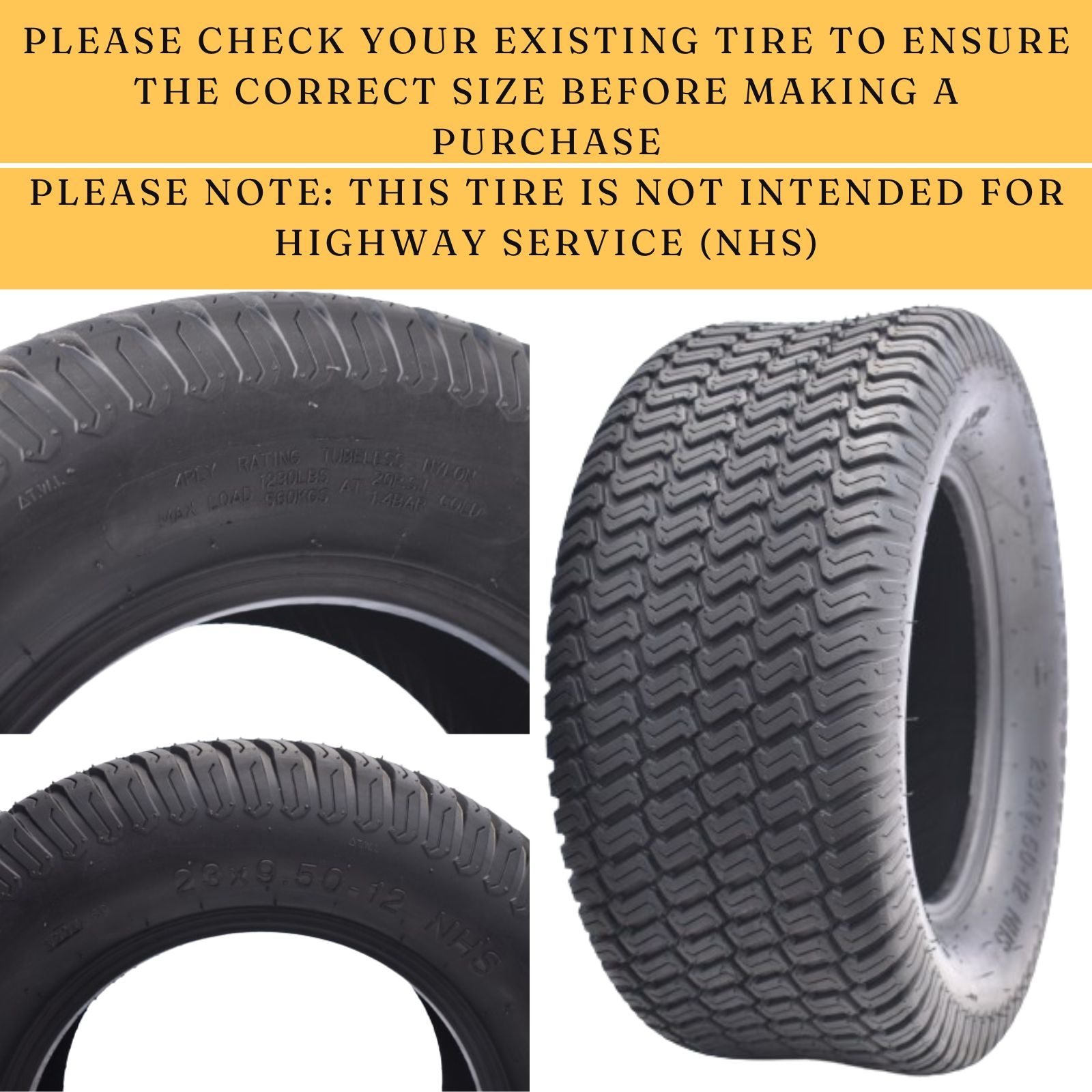Upgrade your lawn care with Dayrim 2 Pcs 23x9.50-12 Lawn Mower Tires. Designed for garden tractors and riding mowers, these 4-ply, tubeless tires offer superior durability and easy installation. The turf tread pattern ensures excellent traction and a smooth ride, protecting your lawn. Engineered for flat or uneven terrain, these robust tires resist punctures and wear, keeping your mower in action longer. Perfect for both residential and commercial use, Dayrim tires provide reliable performance for a well-manicured lawn.